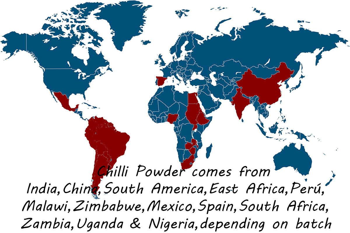 Chilli Powder comes from the dry pods of the Capsicum Frutescens plant which is milled into a powder. These come from a great many places in the world, but they all have the same pungent, spicy flavour. So many spice blends use chilli powder including Taco Seasoning, Barbeque Spice Blend, Fajita Spice Blend, Vindaloo Curry Powder, Madras Curry Powder (Medium and Hot) and so much more!